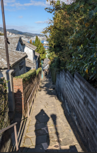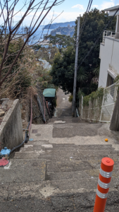 延々と登った坂道を振り返って 普段は一般立入禁止の風景 これから挑む急階段
